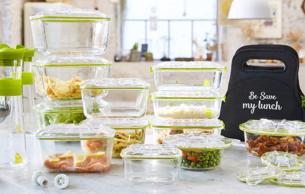 Afin de vous permettre de profiter de la mise sous vide dans tous vos besoins du quotidien, Be Save est proposé avec une large gamme d’accessoires innovants : récipients rectangulaires ou ronds en verre borosilicate d’une solidité inégalée, couvercles universels adaptables à vos propres récipients, pichets et bocaux…
